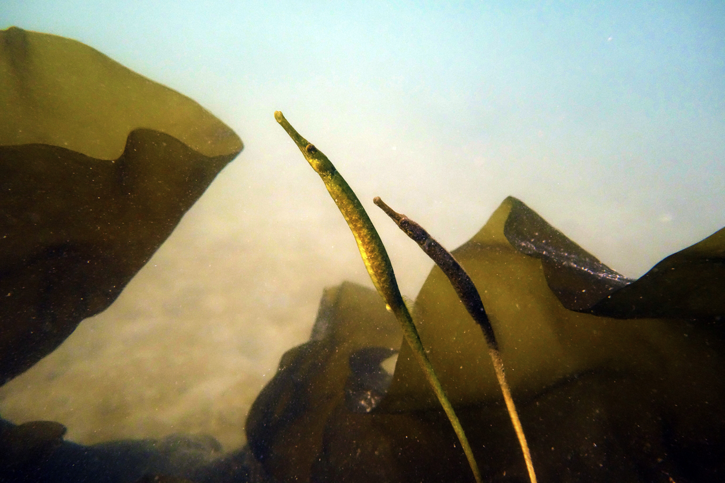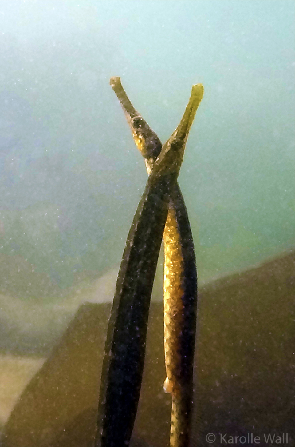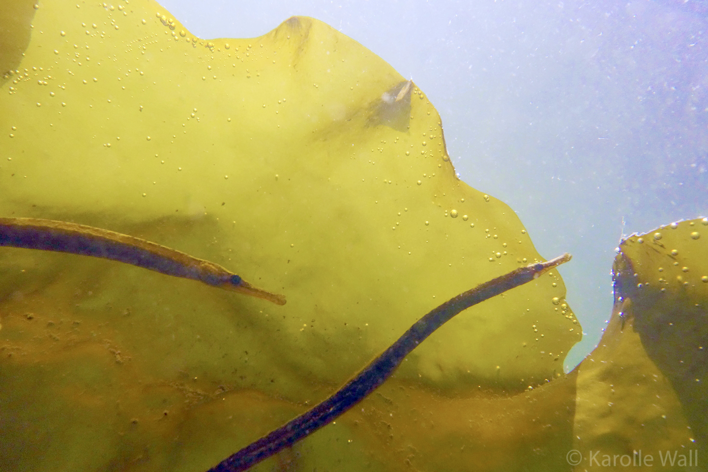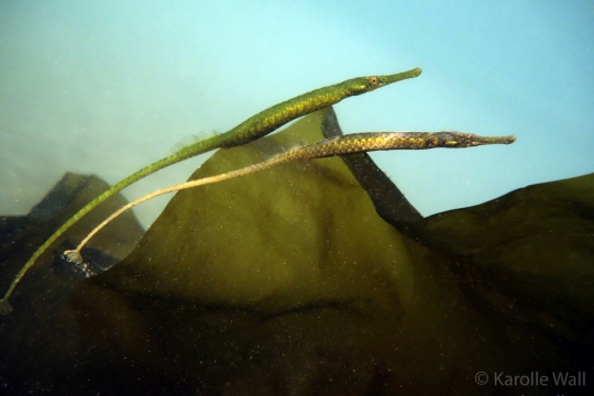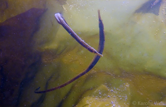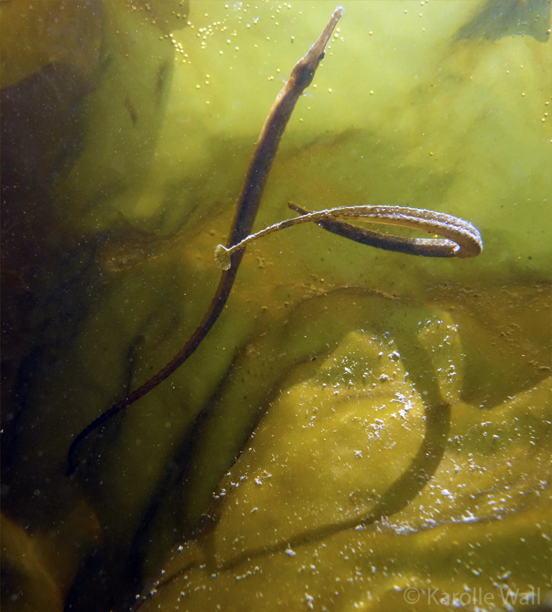 These photos were taken in late May of 2020 while snorkeling in the shallows of Peter Cove, Pender Island — a rare treat to see several Bay Pipefish, Syngnathus leptorhynchus engaging in a mating dance. At one point, a male and female pipefish exchange eggs– the male being the one who will carry the embryos and release tiny, fully formed pipefish at birth.
