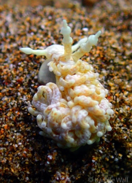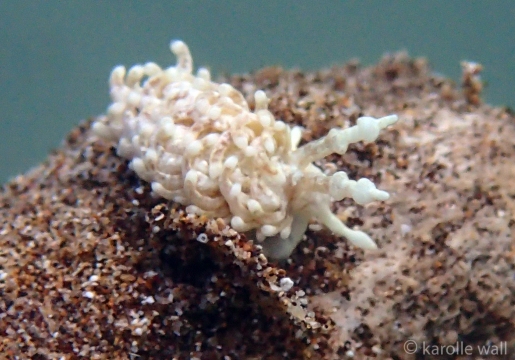 The novice can easily mistake this nudibranch for the Bulbaeolidia alba. Both have pronounced bulbous swellings on their rhinophores. Unlike the alba, the paulae does not rhythmically “click” along, it is more than twice the size at maturity and it has much more defined white tips on its more abundant cerata. It is also rarely seen, whereas the alba is quite common. Found in Ko’ie’ie Fishpond, North Kihei in less than 1 metre (3 ft) of water. For more on its natural history and taxonomy, please see Sea Slugs of Hawaii. Size: 25-30 mm.