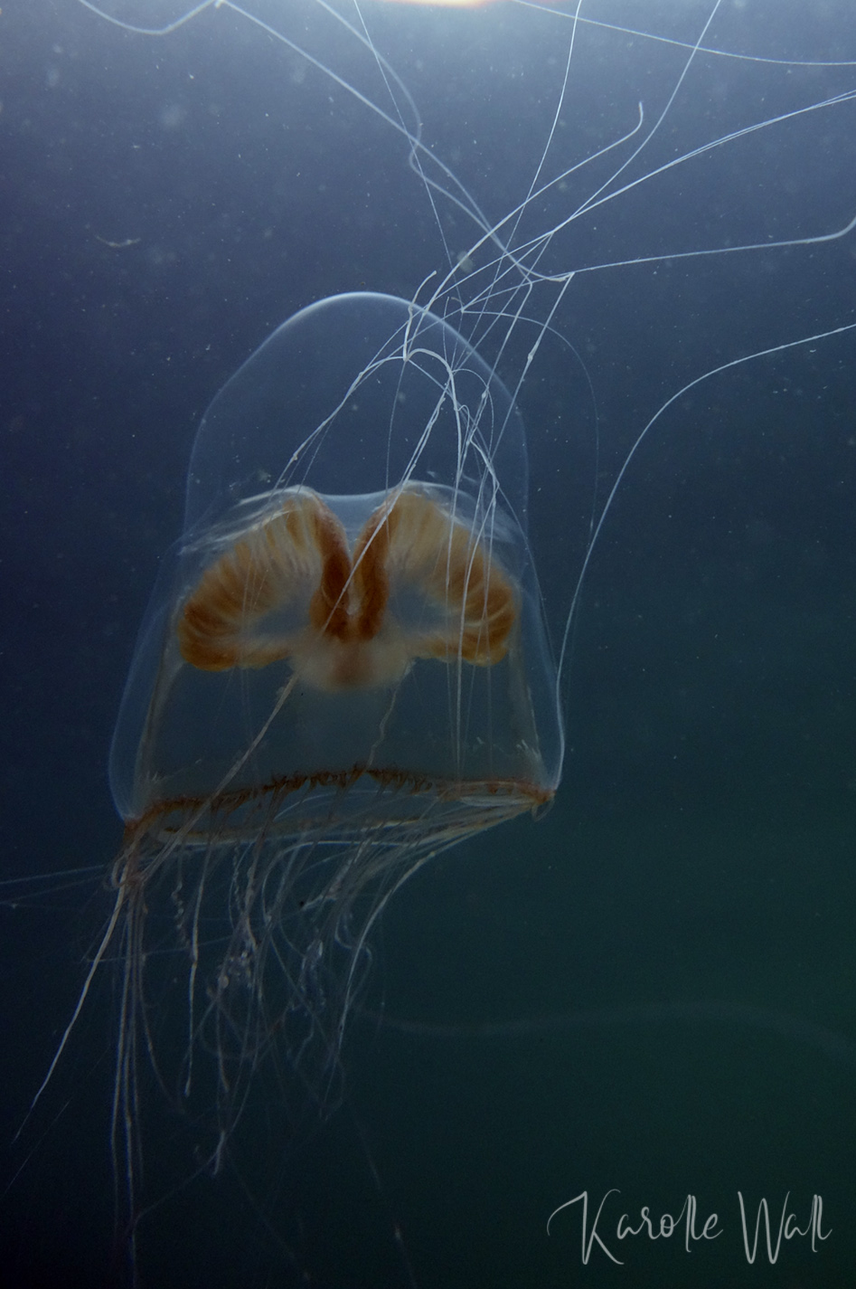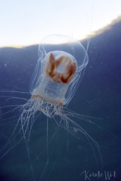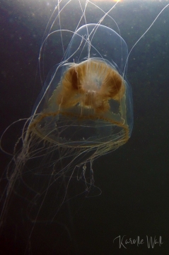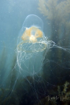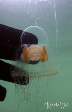 At first, this jelly looks like a much larger version of a Catablema vessicarium sp. nodulosum but its tentacles are far more numerous and its stomach and gonads are generally lighter.  I’ve included an image of my hand in behind an individual in order to provide a sense of scale.