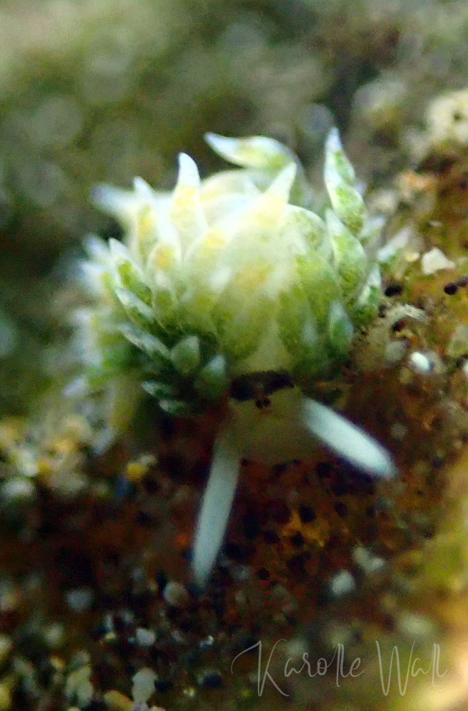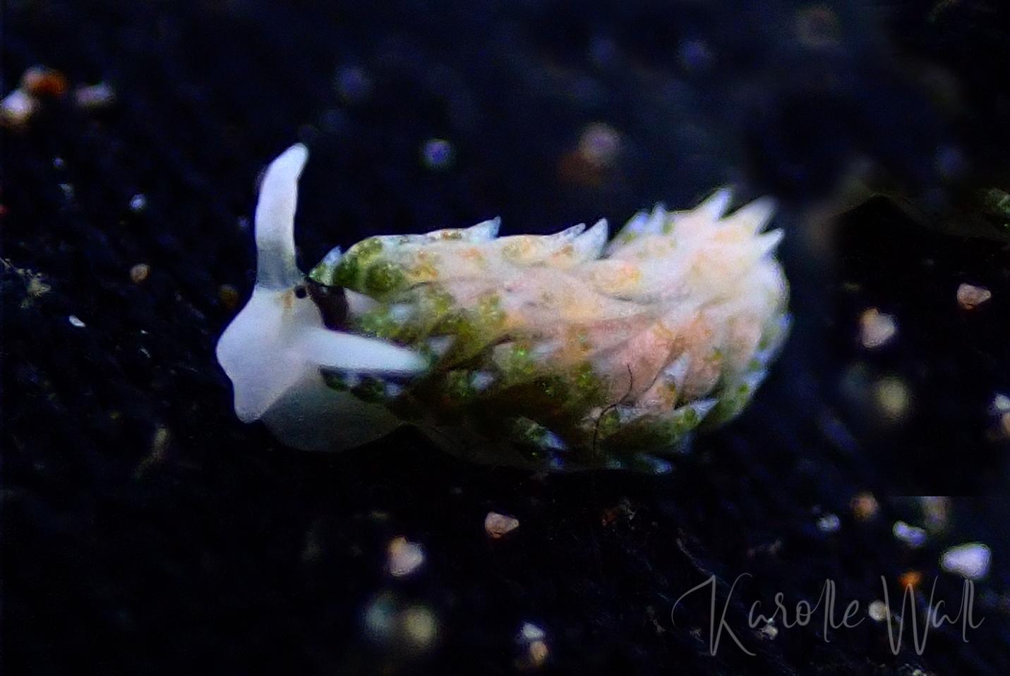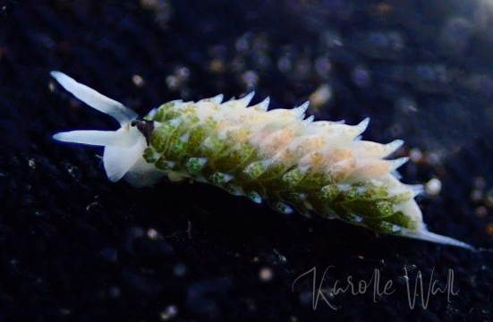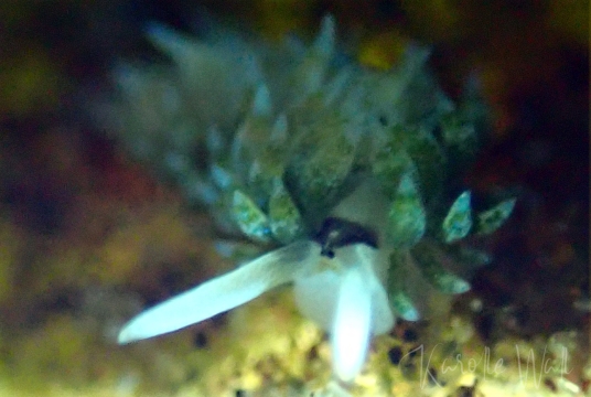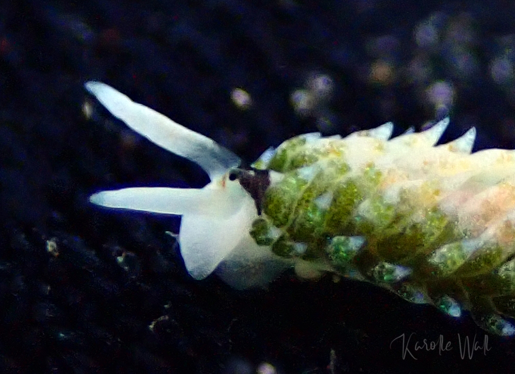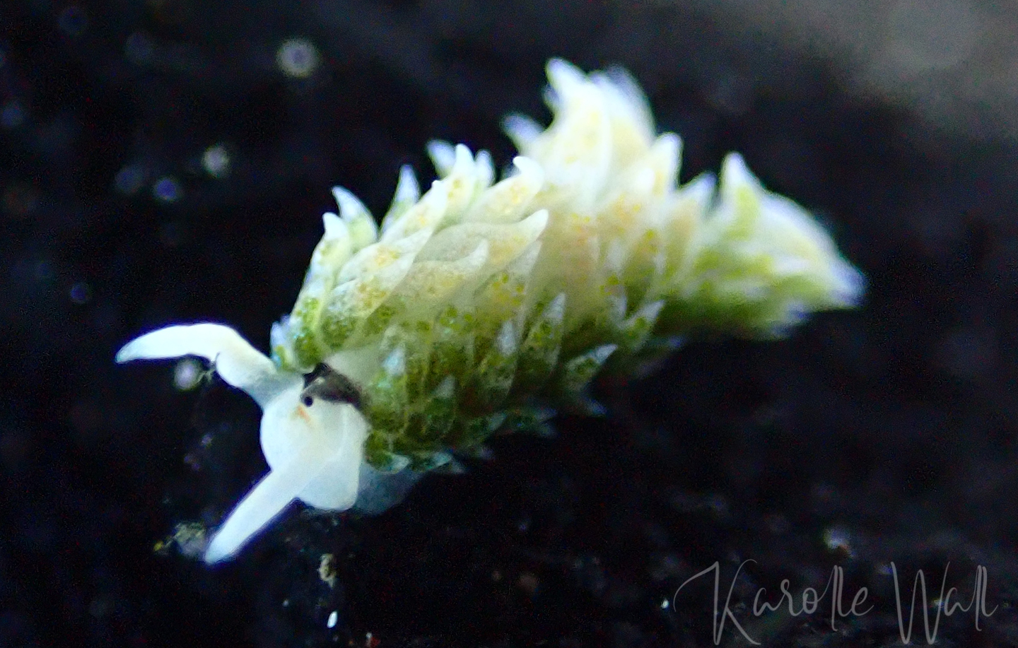 These tiny Costasiella Sp. 1 were found grazing on some mudleaf or Avrainvillea amadelpha alongside a few Costasiella kuroshimae. One of them was notably larger than the C. kuroshimae — likely 4-5 mm. Imagine an animal less than 1/4 of an inch, in a sandy surge zone on a piece of algae covered in sand and you’ll understand why it was such a gift to find these. The most notable identifying characteristics: a light white/cream body with white speckles, a dark mask behind the eye spots and cerata that have tinges of green, orange and blue — sometimes quite iridescent. These animals were found in less than 10 ft (3 metres) in Ma’alaea Bay, Maui. For more images and taxonomic information please see Sea Slugs of Hawaii.
