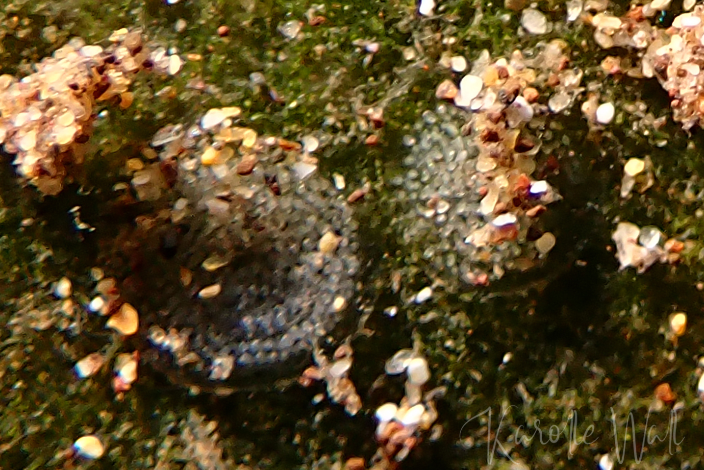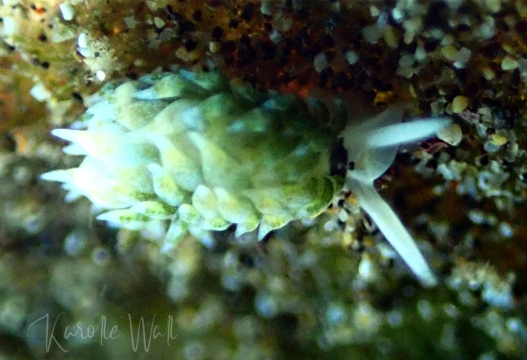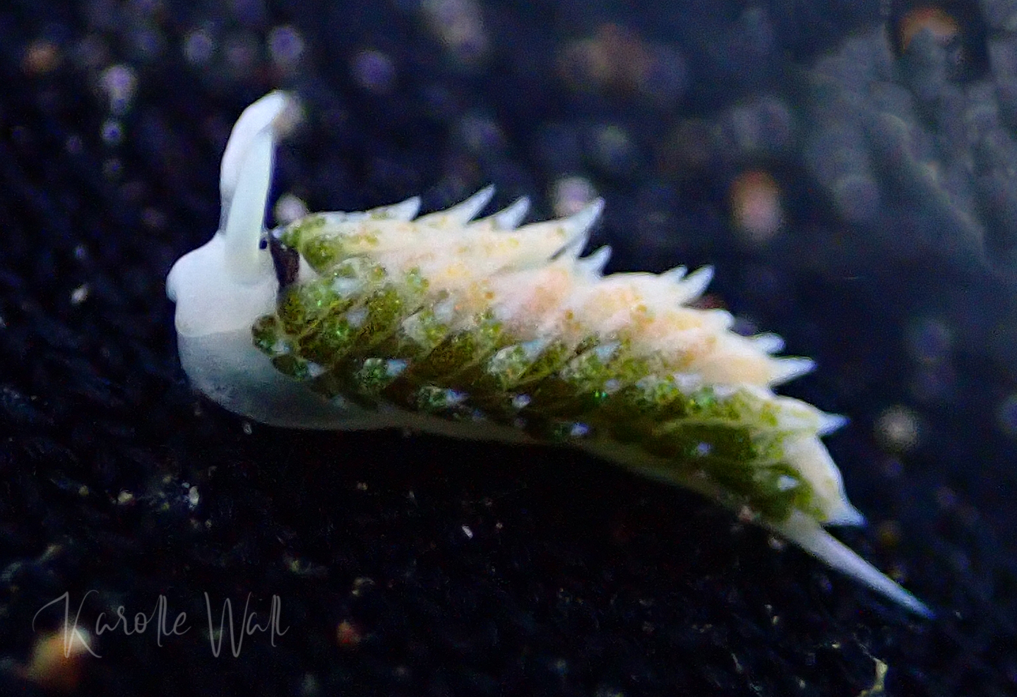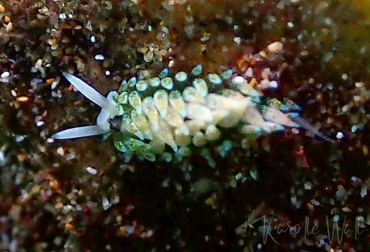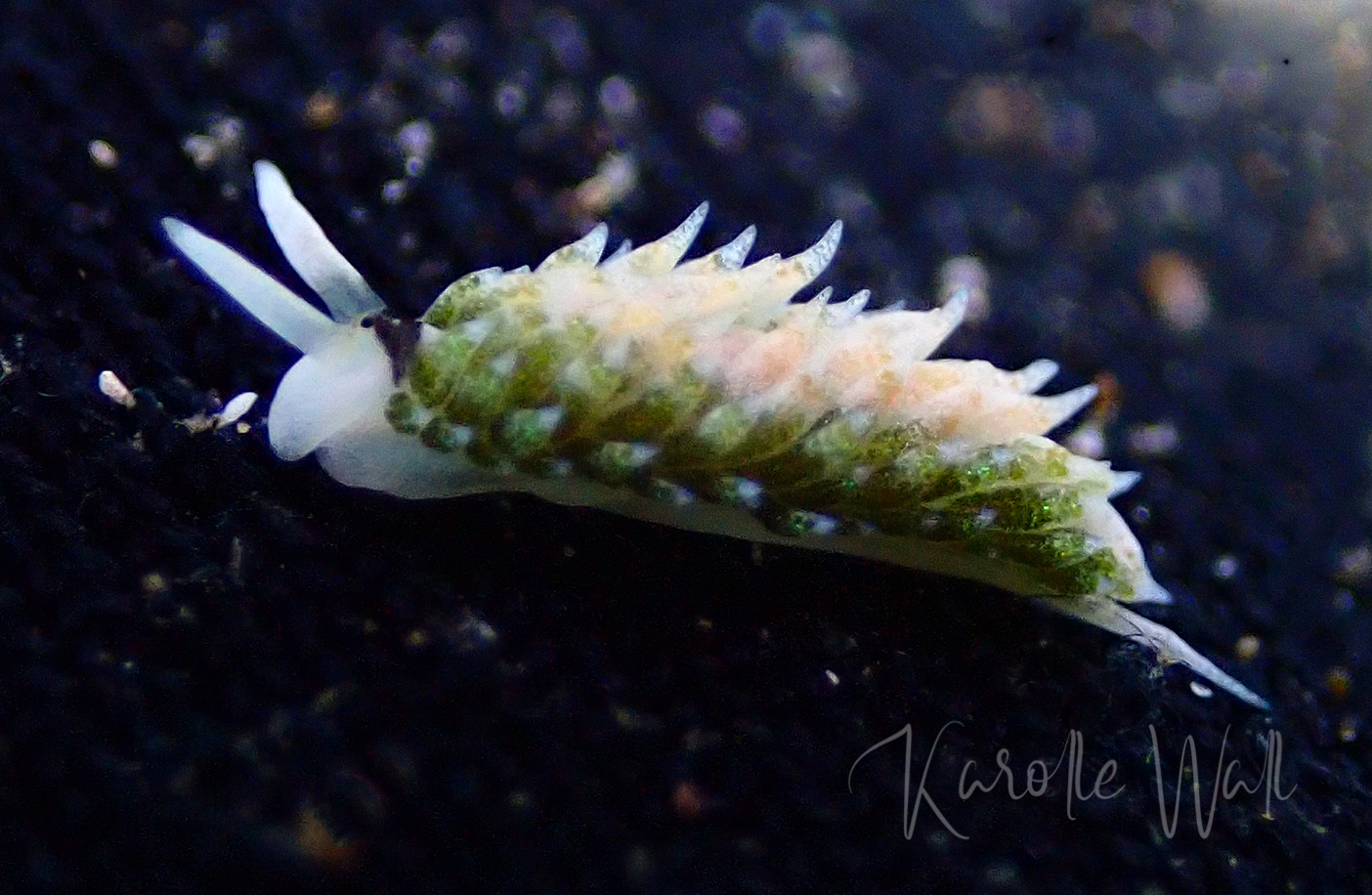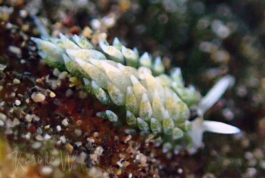 These tiny Costasiella Sp. 1 were found grazing on some mudleaf or Avrainvillea amadelpha alongside a few Costasiella kuroshimae. One of them was notably larger than the C. kuroshimae — likely 4-5 mm. Imagine an animal less than 1/4 of an inch, in a sandy surge zone on a piece of algae covered in sand and you’ll understand why it was such a gift to find these. The most notable identifying characteristics: a light white/cream body with white speckles, a dark mask behind the eye spots and cerata that have tinges of green, orange and blue — sometimes quite iridescent. These animals were found in less than 10 ft (3 metres) in Ma’alaea Bay, Maui. For more images and taxonomic information please see Sea Slugs of Hawaii.