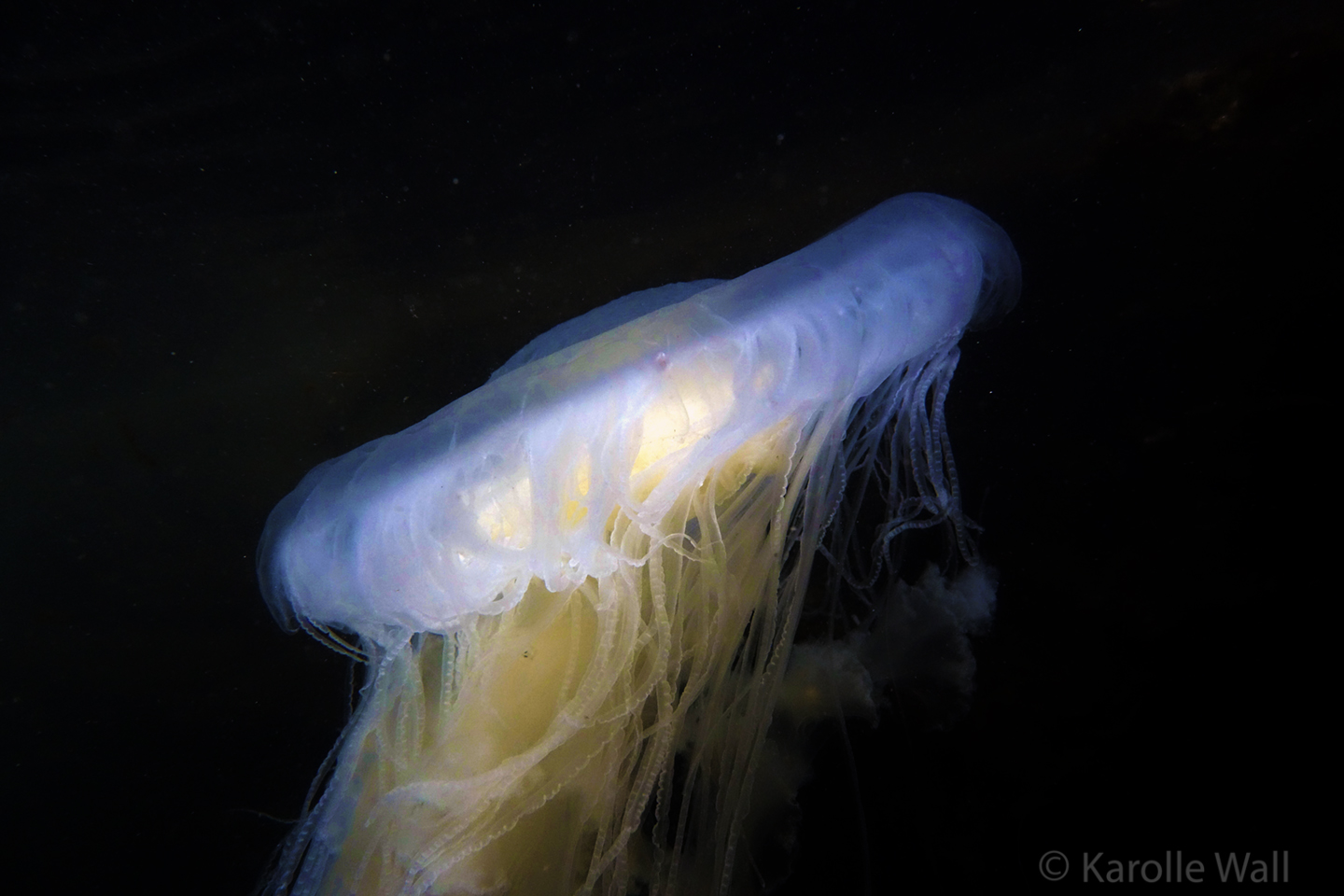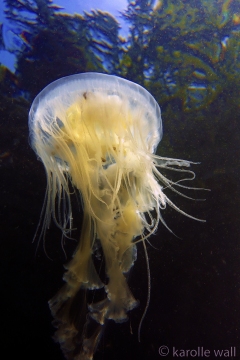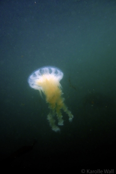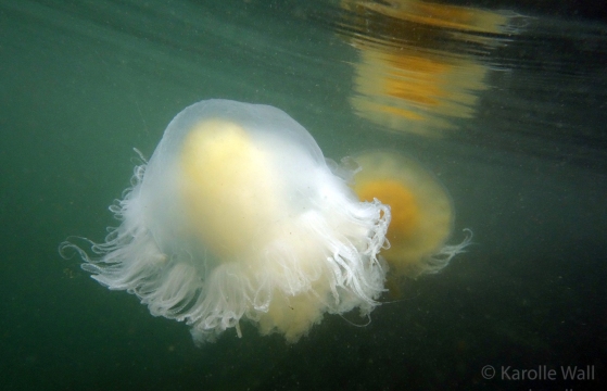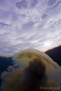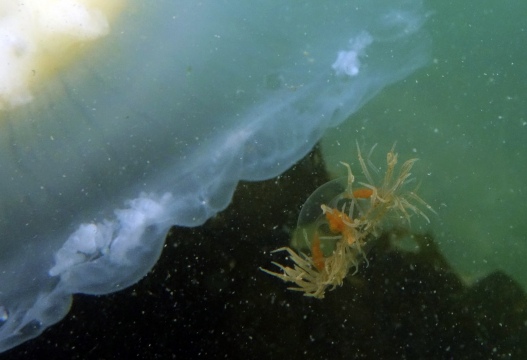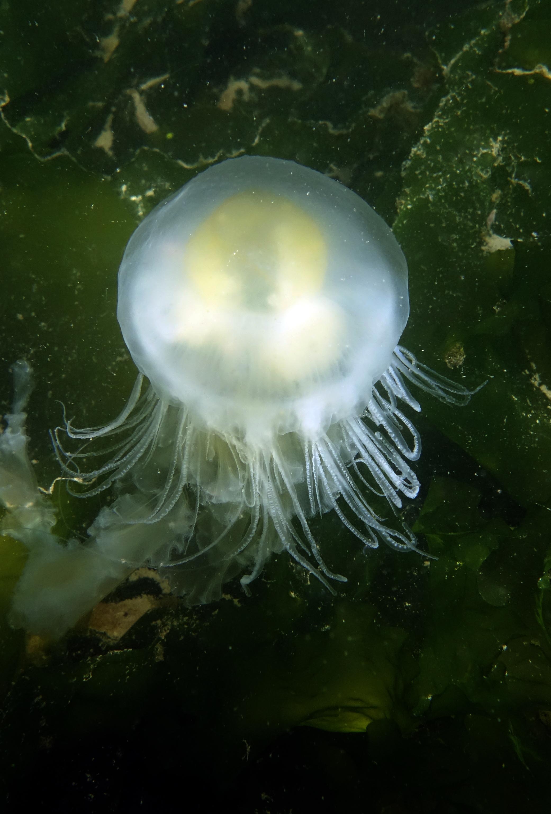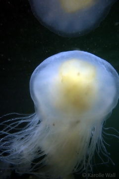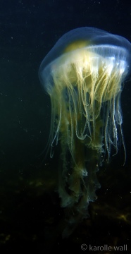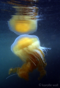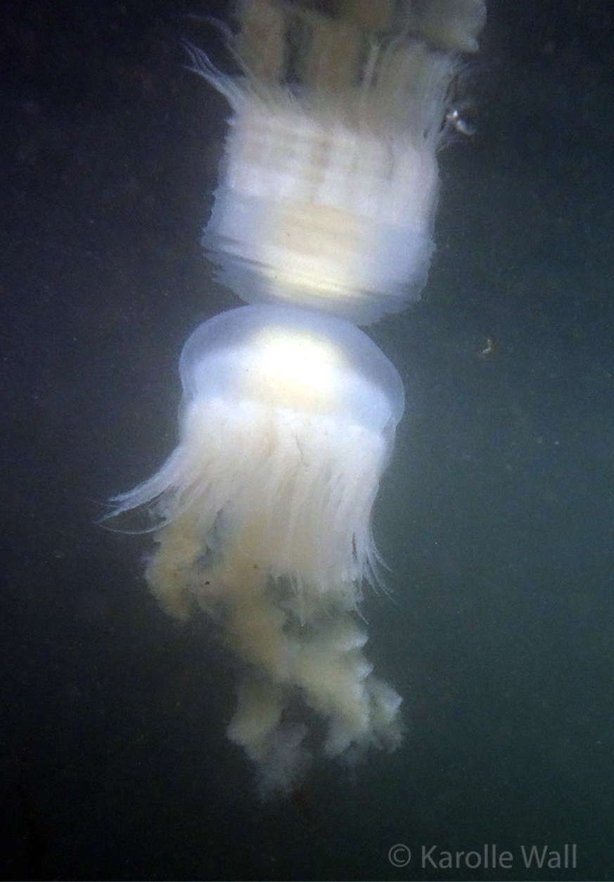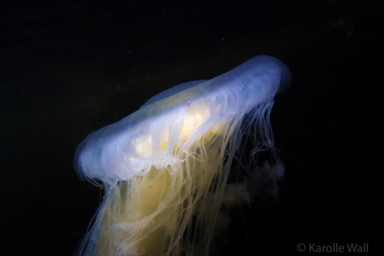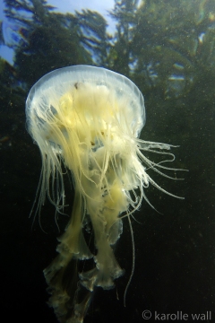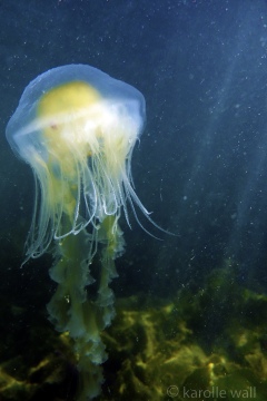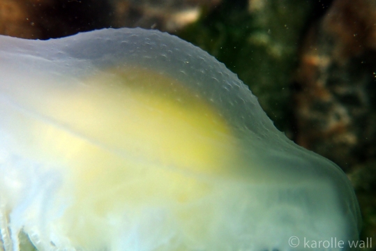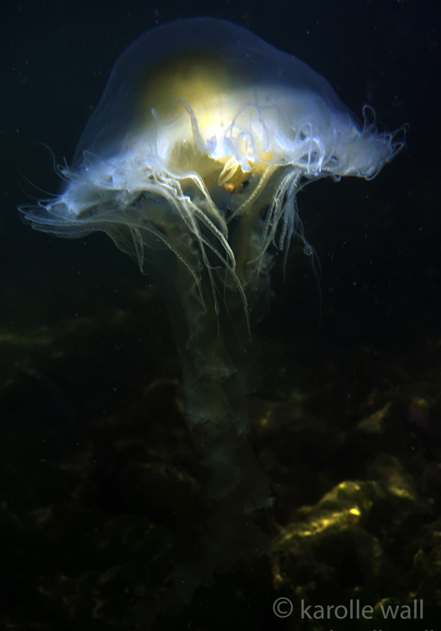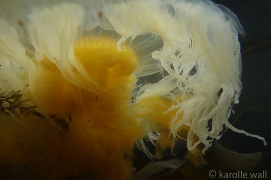 This is one of the most striking and appropriately named cnidarians of the Pacific Northwest/Salish Sea. Over the past few years I have come across juveniles as small as 50mm (2″) across the bell to animals as large as 60 cm (2 ft) across with copious tentacles as long as 3 metres (10 ft). — all hanging out in relatively shallow coves, The Egg-yolk Jelly is certainly one of my favourite marine animals to photograph. The right angle of sunlight will often filter through and refract the white section of the bell mantle and tentacles in spectacular ways, enabling the yellow gonads at the centre to burn in bright contrast.