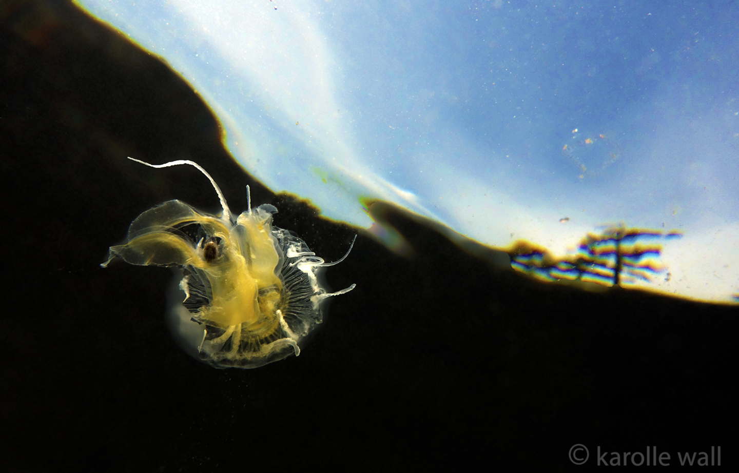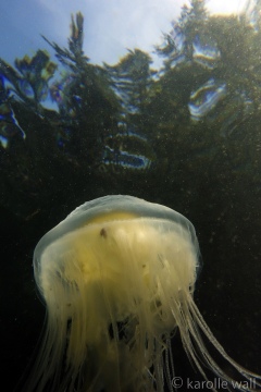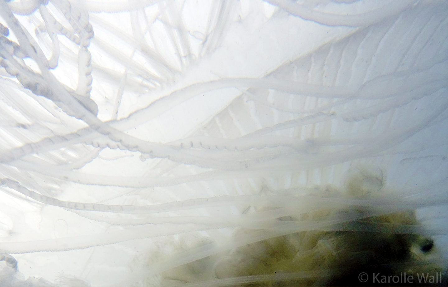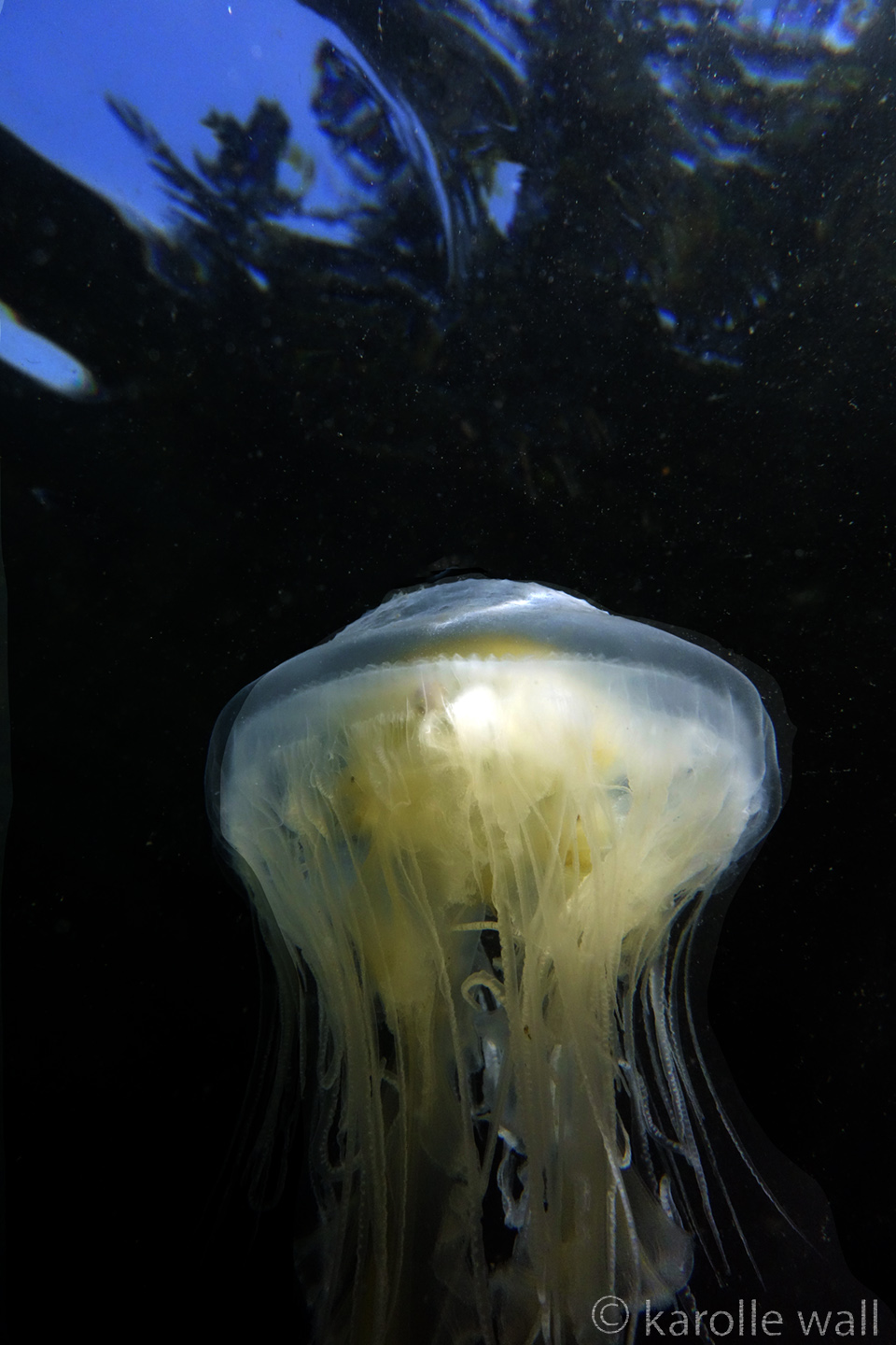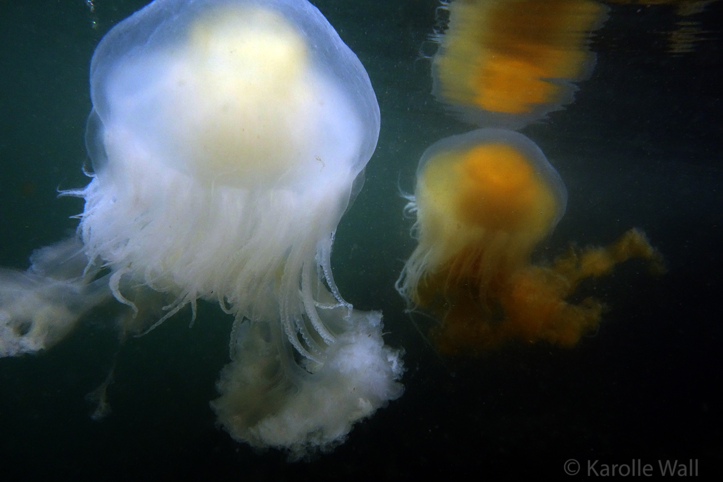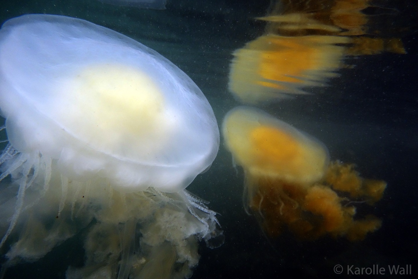 This is one of the most striking and appropriately named cnidarians of the Pacific Northwest/Salish Sea. Over the past few years I have come across juveniles as small as 50mm (2″) across the bell to animals as large as 60 cm (2 ft) across with copious tentacles as long as 3 metres (10 ft). — all hanging out in relatively shallow coves, The Egg-yolk Jelly is certainly one of my favourite marine animals to photograph. The right angle of sunlight will often filter through and refract the white section of the bell mantle and tentacles in spectacular ways, enabling the yellow gonads at the centre to burn in bright contrast.
