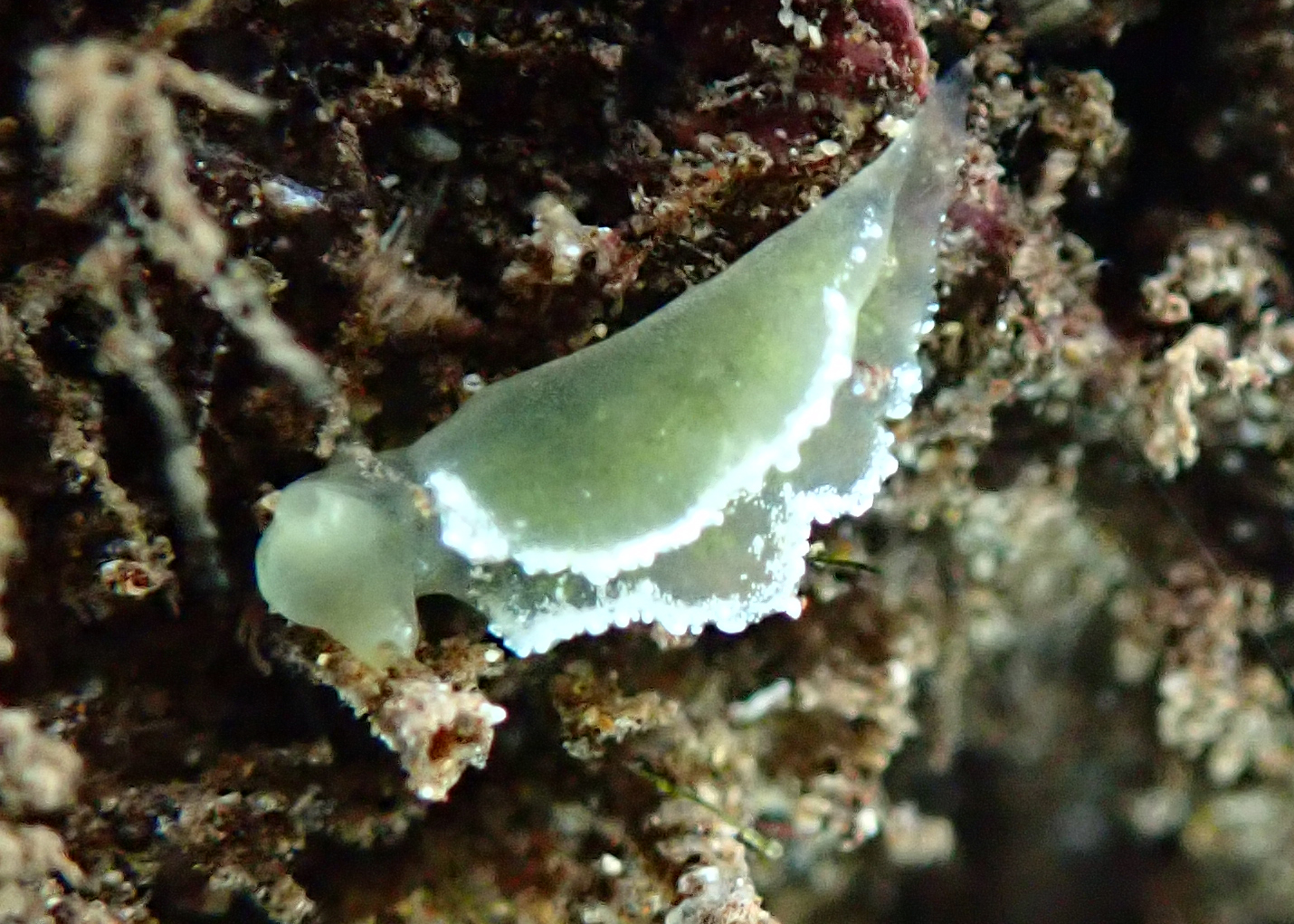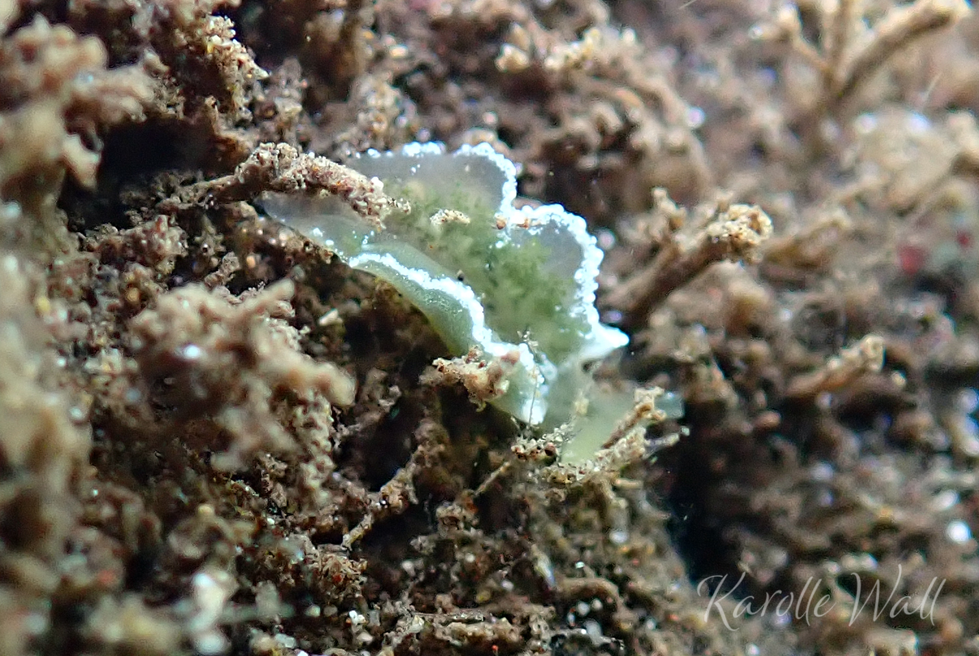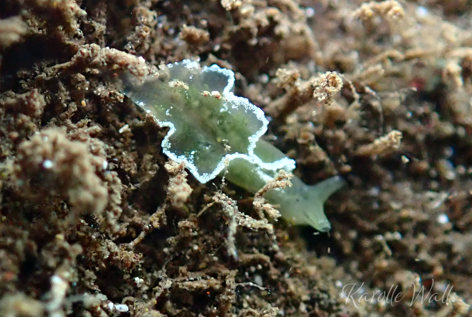 I have only ever seen one of these Elysia obtusa– a juvenile that was no bigger than 4 mm. Its bright emerald green colour threw me off an initial identification as these are usually more of a goldish-yellow colour. There is some suggestion that the strong green colour corresponds with a recent feeding and even in this tiny animal the green digestive glands are quite obvious. Found in less than 1.5 metres of water in a semi-protected surge zone in North Kihei, Maui. For more information and photos see Sea Slug Forum and Sea Slugs of Hawaii.