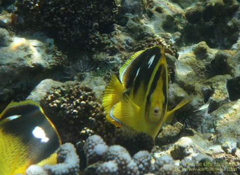 Although Fourspot Butterflyfish are not abundant, they are still a relatively common sight on Maui. They usually pair up but are occasionally seen in small schools or alone. They are corallivores who feed primarily on Pocillopora  (more commonly known as Cauliflower Coral) and will most certainly be one of the species negatively affected by large coral bleaching events. To six inches. For more information regarding their range, red list status, and feeding habits, see the IUCN Red List site.