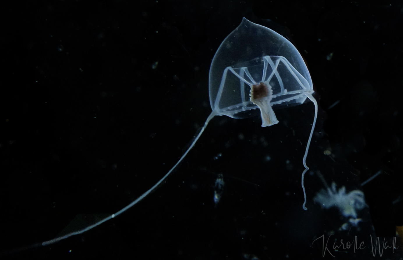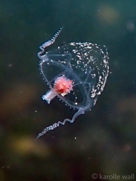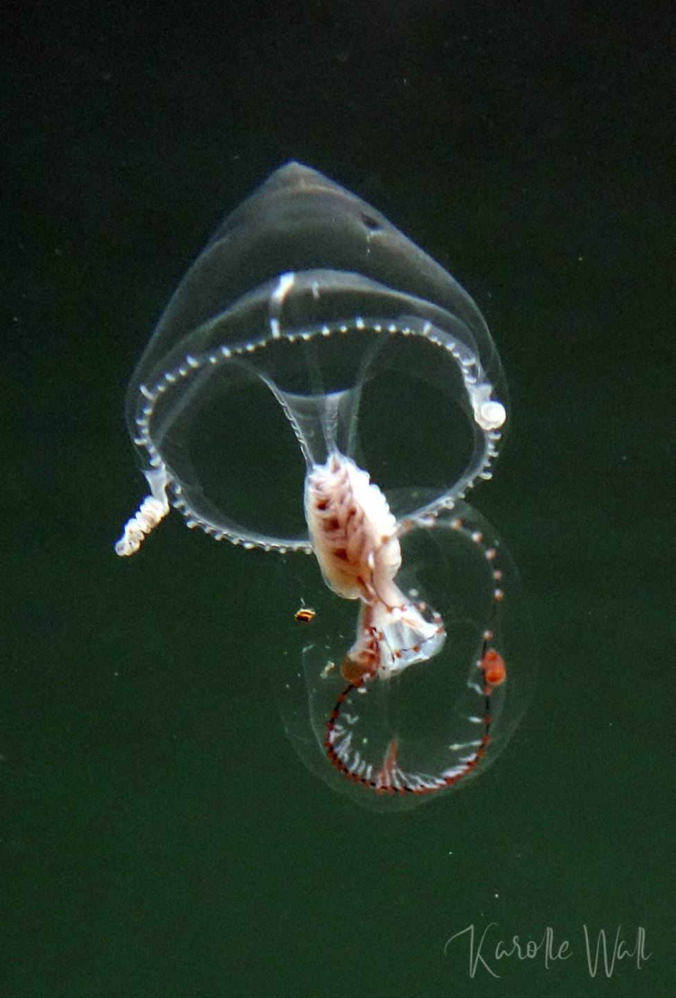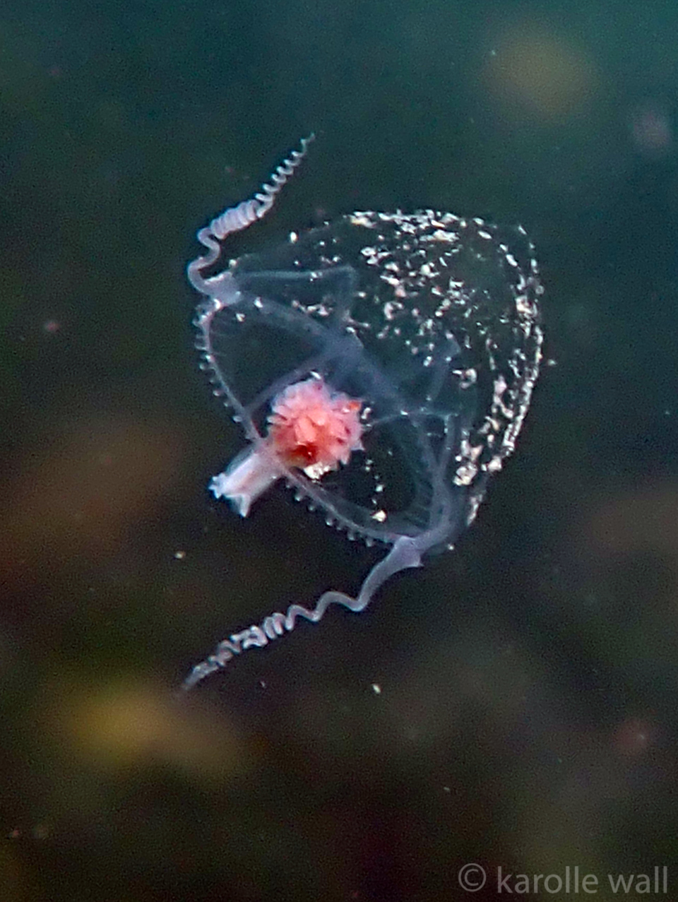This jelly gets its common name for obvious reasons.  It wasn’t until I saw it in action, using its stomach as a kind of sucking vortex on a Clytia Gregaria (see photo in gallery) that I realized that its design made some sense.