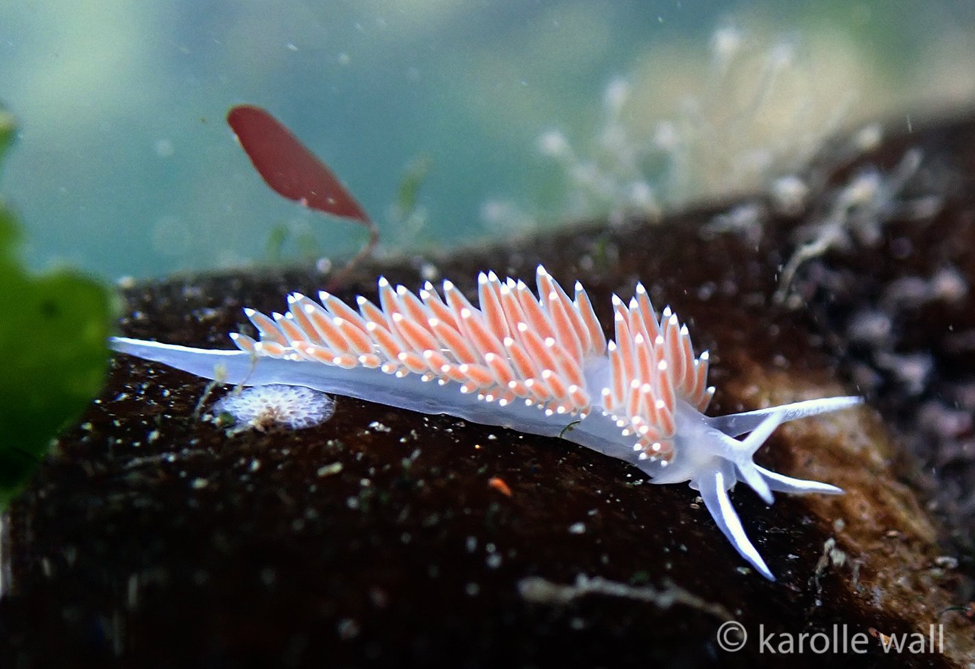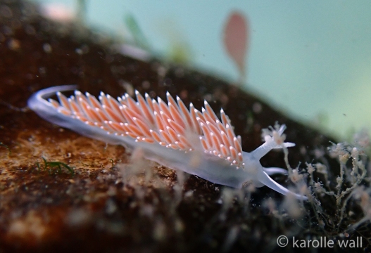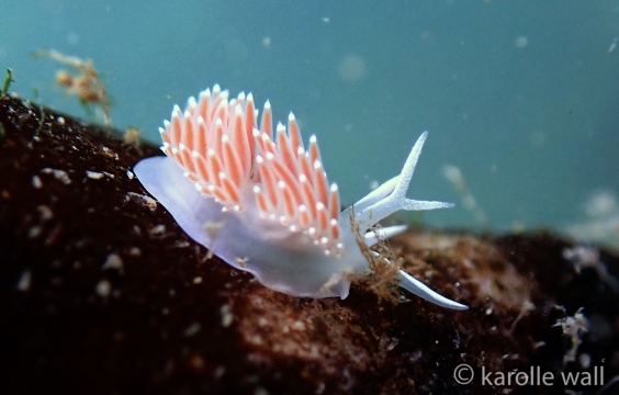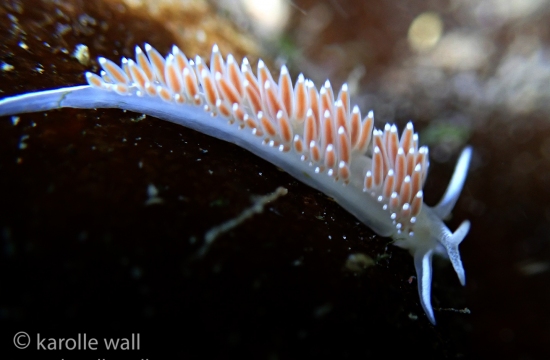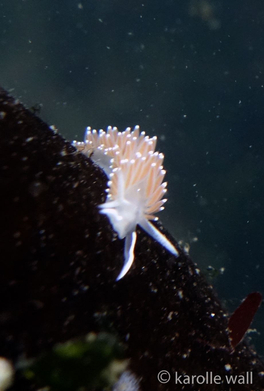 This is just a quick update. Will explain further when I have a moment. The “Red-fingered Coryphella” has gone through another taxon change and is now the Coryphella longicaudata. For the novice, Coryphella longicaudatta is just about impossible to distinguish from the Coryphella trophina. There have been several taxon changes in the Flabellinidae family (of which this previously belonged) and my guess seems to be almost as good as that of the experts. The Coryphella longicaudata has a longer tail and rhinophores, a shorter nose (rostrum) and fairly prominent eye spots that are close together and just below the rhinophores The individuals pictured below seems to fit that description well. Should you have a scientific mind (or wish to immerse yourself in that kind of dialogue) this article regarding the taxon changes of the Flabellinidae family might be just the thing to keep you awake. This article on the taxonomic split of the Coryphellidae species has some good photos of the C. verocosa, now C. longicaudata, and a thorough discussion of the differences between several arctic and Atlantic species. (I will update this part soon)