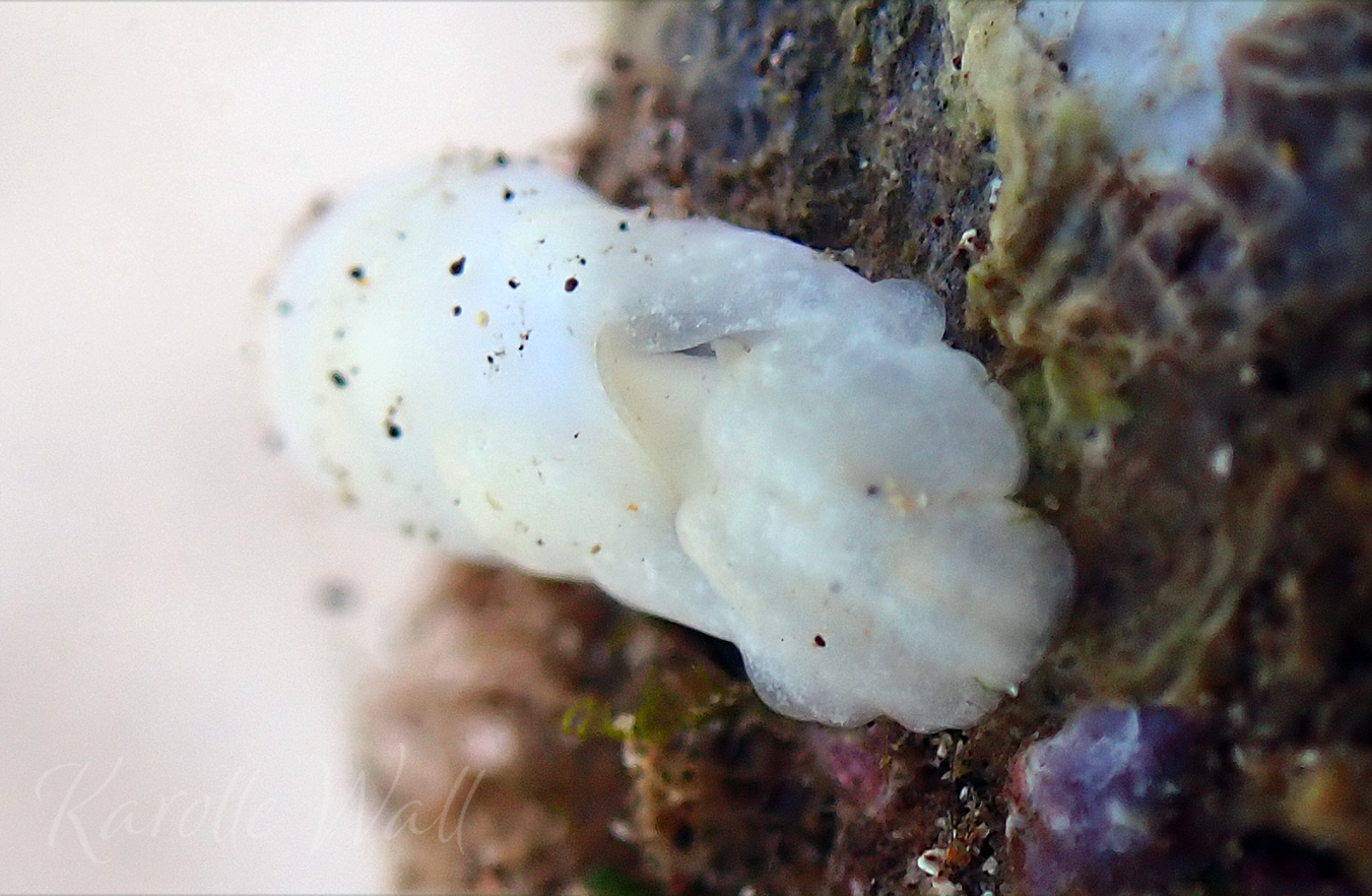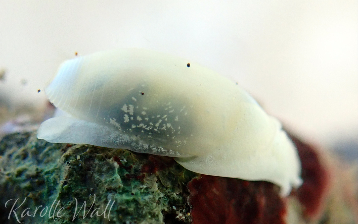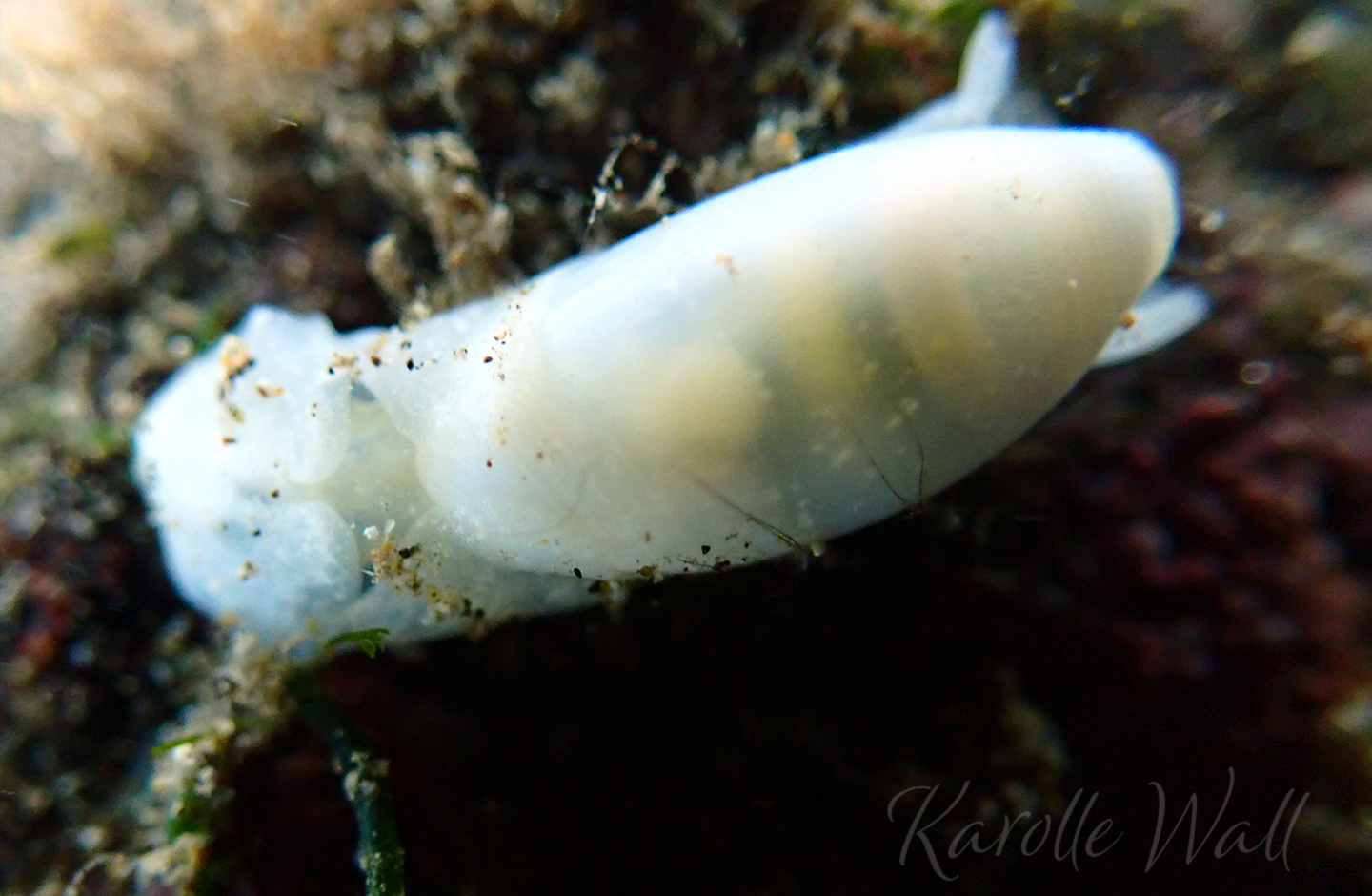 This is a rather drab looking headshield slug, but one that is rarely seen as it prefers to bury itself in sand and is nocturnal. I only noticed it when it went flying through the water column after a goatfish disturbed the sand. A close examination reveals spiral markings on its shell and some white spots against its creamy/grey body. Apparently, it can swim by flapping its parapodia, but I just saw it hit the sand with barely a flutter. Found in about 1 metre of water in a protected fishpond in Nth Kihei. For more photos and taxonomic information, please see Sea Slugs of Hawaii.