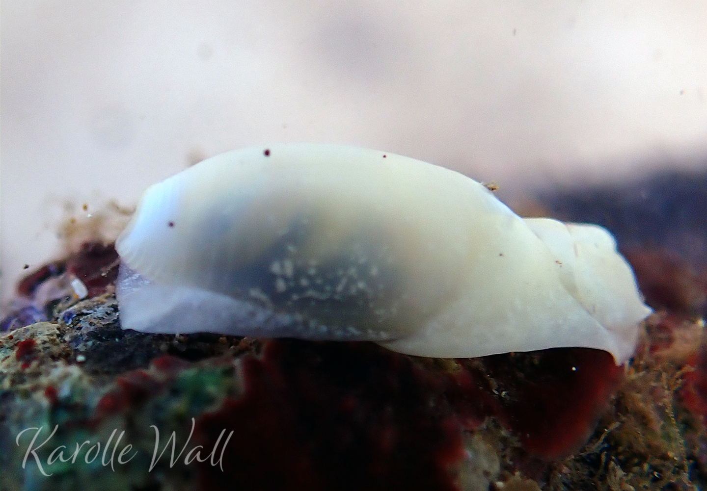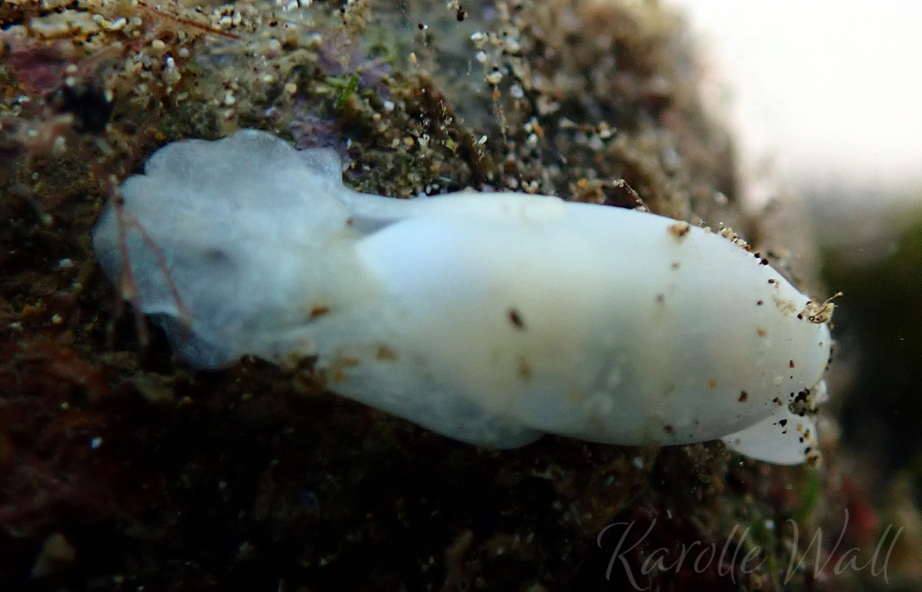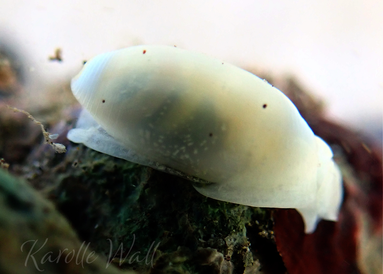 This is a rather drab looking headshield slug, but one that is rarely seen as it prefers to bury itself in sand and is nocturnal. I only noticed it when it went flying through the water column after a goatfish disturbed the sand. A close examination reveals spiral markings on its shell and some white spots against its creamy/grey body. Apparently, it can swim by flapping its parapodia, but I just saw it hit the sand with barely a flutter. Found in about 1 metre of water in a protected fishpond in Nth Kihei. For more photos and taxonomic information, please see Sea Slugs of Hawaii.