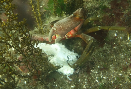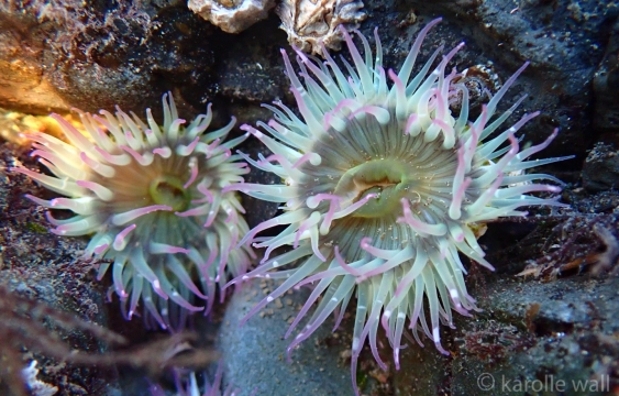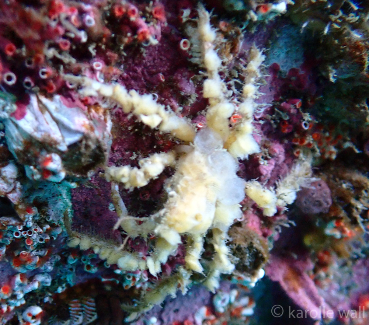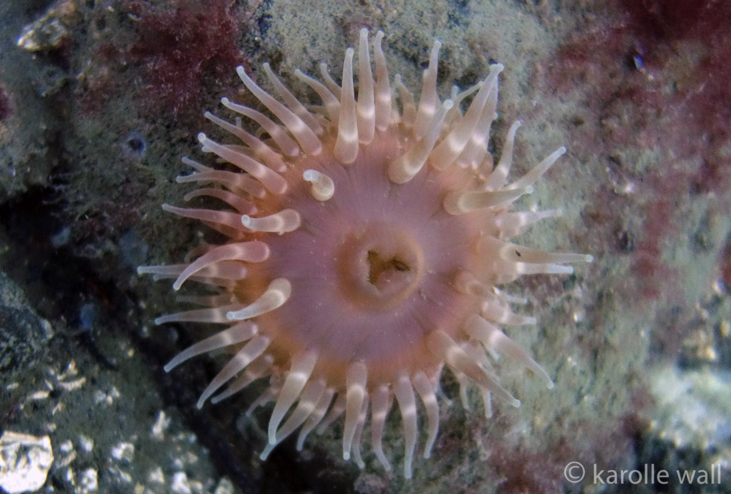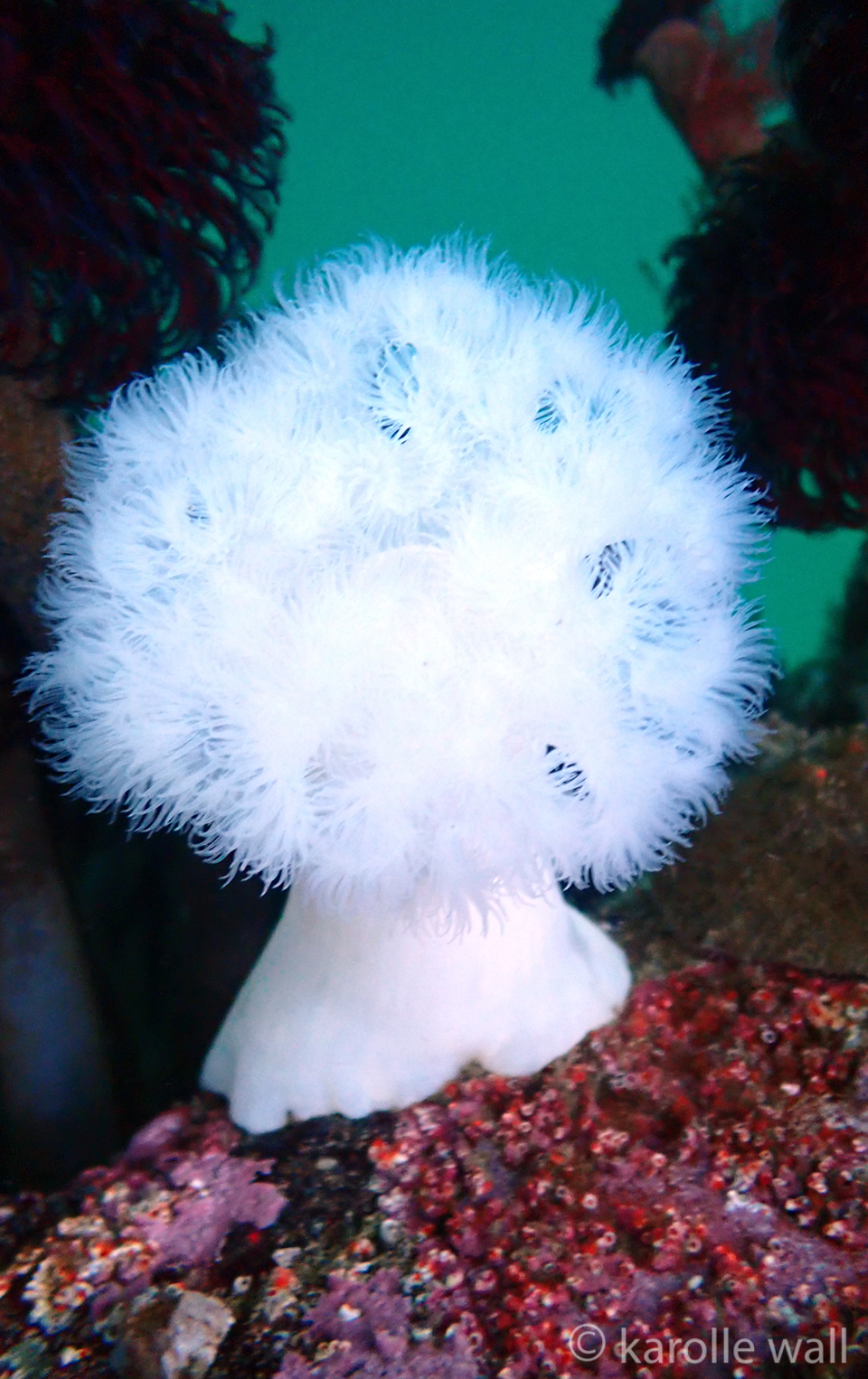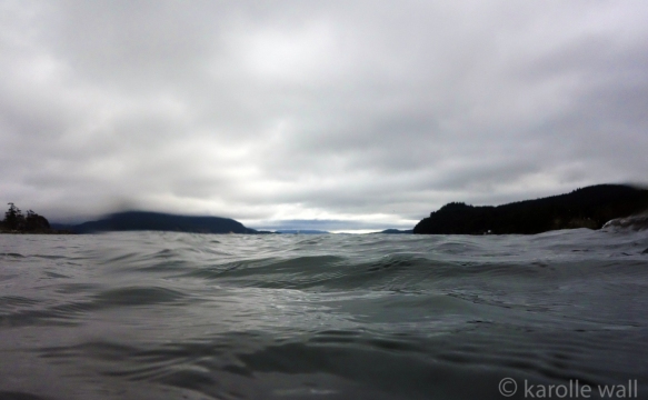 The water has been cold — between 6 & 8° C (43 to 47° F) but the purchase of a Yazbek 7.5 mm open cell wetsuit has made a huge difference to my ability to stay in winter waters.  Everyone always speaks of the beautiful clarity of the British Columbia ocean in the winter, but I have yet to see this.  Strong winds and fresh water run-off have created murky waters and low visibility.  The positive? When fresh water meets salt, it creates a turbulent, refractory effect and lightens the usual deep emerald waters to a lovely turquoise..  These photos were taken in four different areas off of S,dayes’ — Welcome Bay, Boat Nook, Peter Cove S., and McKinnon Road Beach.